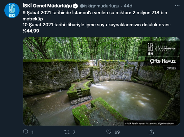 9 Şubat 2021 tarihinde İstanbul'a verilen su miktarı: 2 milyon 718 bin metreküp 10 Şubat 2021 tarihi itibariyle içme suyu kaynaklarımızın doluluk oranı: %44,99