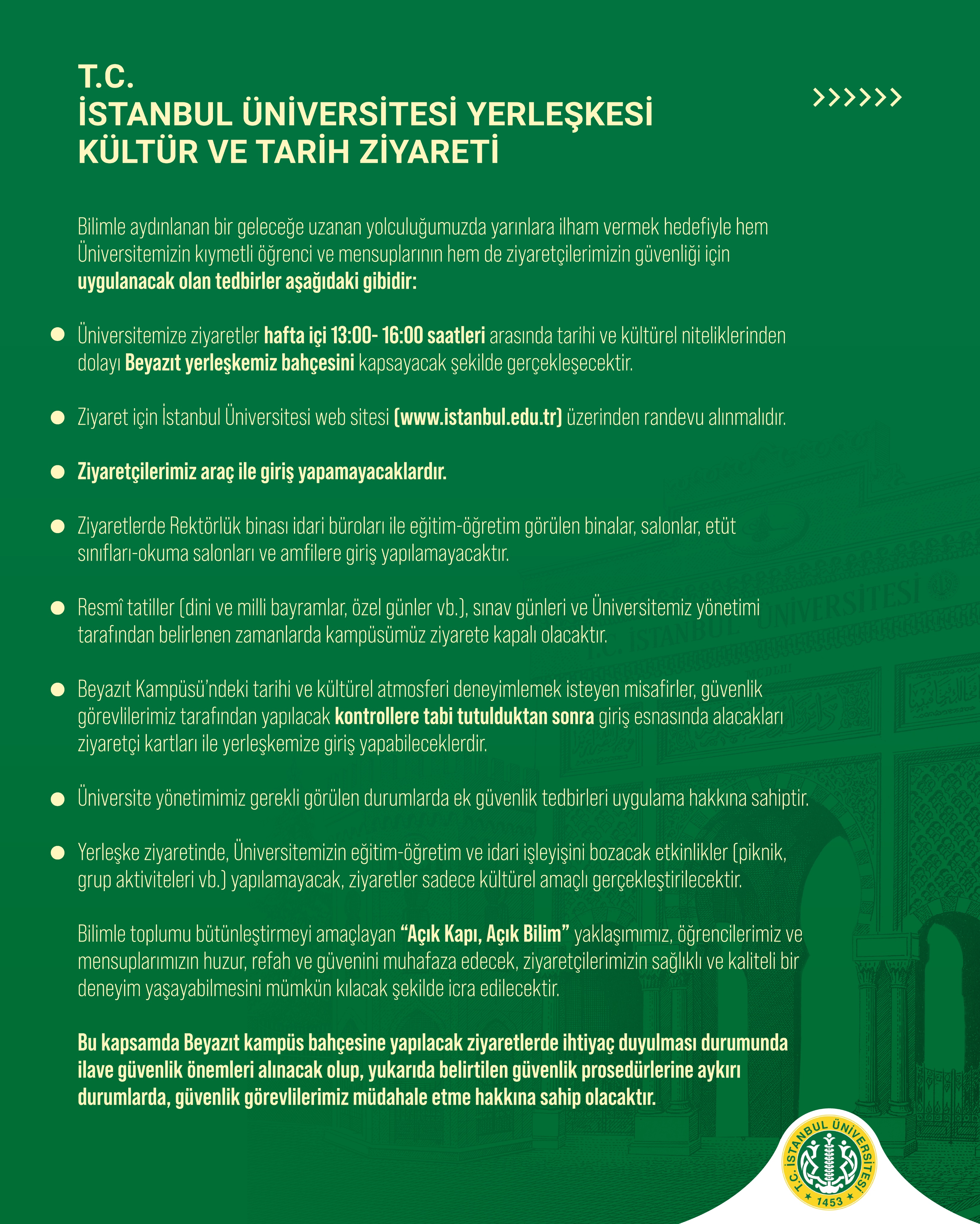 Bu kapsamda Beyazıt kampüs bahçesine yapılacak ziyaretlerde ihtiyaç duyulması durumunda ilave güvenlik önemleri alınacak olup, yukarıda belirtilen güvenlik prosedürlerine aykırı durumlarda, güvenlik görevlilerimiz müdahale etme hakkına sahip olacaktır.”