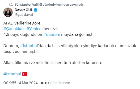 Saat 21:39'da Çanakkale'nin Yenice ilçesinde meydana gelen deprem İstanbul başta olmak üzere birçok çevre illerden hissedildi. İstanbul'da da oldukça şiddetli hissedilen depremin ardından İstanbul Valisi Davut Gül sosyal medya hesabı X üzerinden açıklamalarda bulundu.