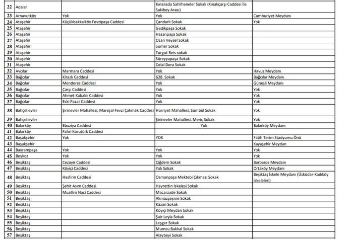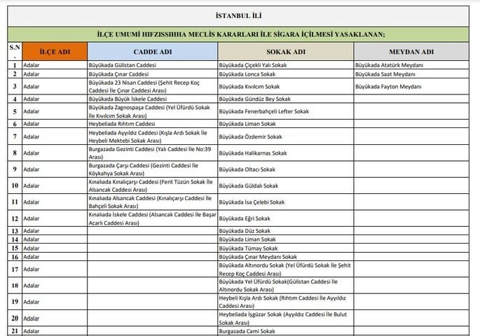Açıklamaya şöyle devaöm edildi: "İstanbul'da koronavirüs salgını ile mücadele kapsamında virüsün yayılımını önlenmek amacıyla İl Hıfzıssıhha Meclisimizin 102 numaralı kararı doğrultusunda (İçişleri Bakanlığının 11.11.2020 tarih ve 18579 sayılı genelgesi çerçevesinde; Maskenin doğru ve sürekli şekilde kullanımını temin amacıyla 12.11.2020 tarihinden itibaren tüm İlimizde İlçe Hıfzıssıhha Kurulları Kararları ile belirlenecek, vatandaşlarımızın yoğun olarak bulunduğu/bulanabileceği cadde ve sokaklar (özellikle trafiğe kapalı olanlar),ihtiyaç duyulan meydanlar ve toplu taşıma araç durakları gibi alanlarda/bölgelerde sigara içilmesinin yasaklanmasına) 39 İlçemizin ayrı ayrı İlçe Umumi Hıfzıssıhha Meclis kararları ile toplamda 125 sokak, 93 cadde ve 84 meydanda sigara içilmesi yasaklanmıştır.
