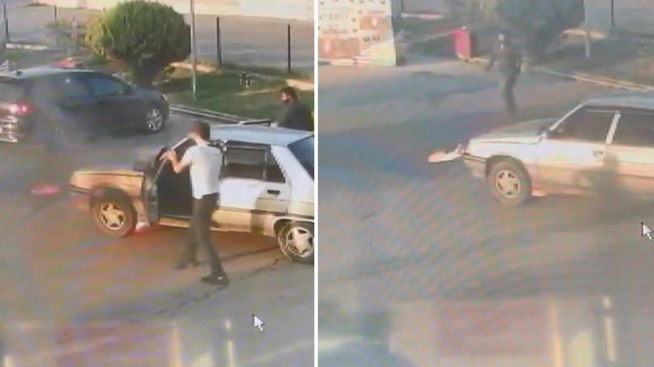 Otomobilin bir anda alev aldığını fark eden iki kişi can havliyle araçtan kendilerini dışarıya attı. Yaşanan korku dolu anlar güvenlik kamerasına saniye saniye yansıdı.