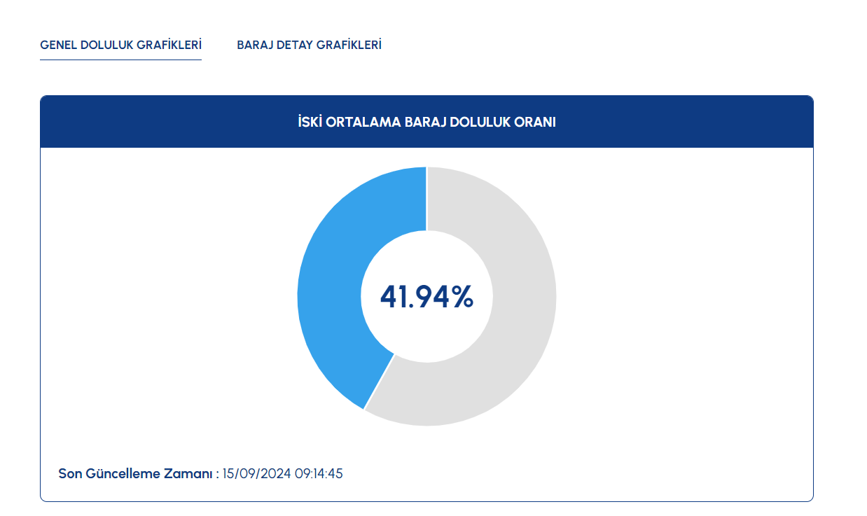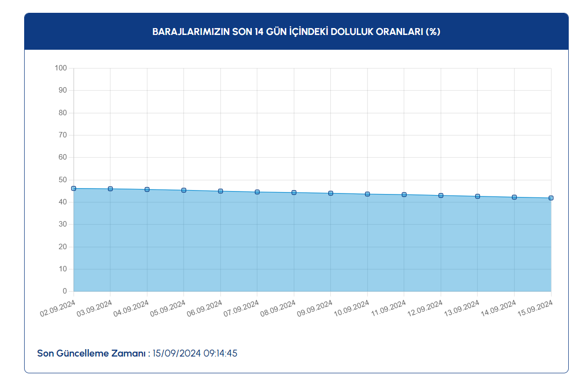 İstanbul Su ve Kanalizasyon İdaresi’nin yayınlamış olduğu verilerine göre, şehirde barajların ortalama doluluk oranı 8 Eylül'de 44.38 iken bugünkü yani 15 Eylül'deki verilere göre yüzde 41.94 haline geldi.