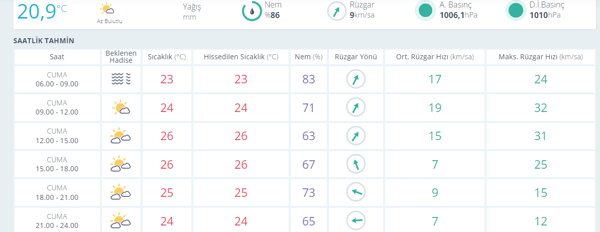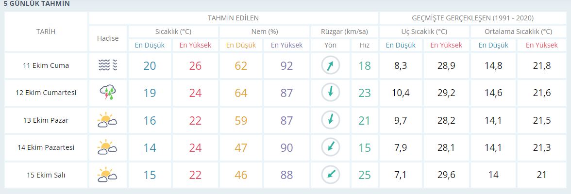 Yetkililer uyardı cumartesi günü kuvvetli yağış olabiliri.Yağışın etkili olduğu cumartesi günü sıcaklıkların 4 ila 5 derece arasında düşmesi bekleniyor. Pazar günü ise parçalı bulutlu bir hava hakim olacak. Pazar günü sıcaklıklar 19 -22 derece olması tahmin edilmekte.