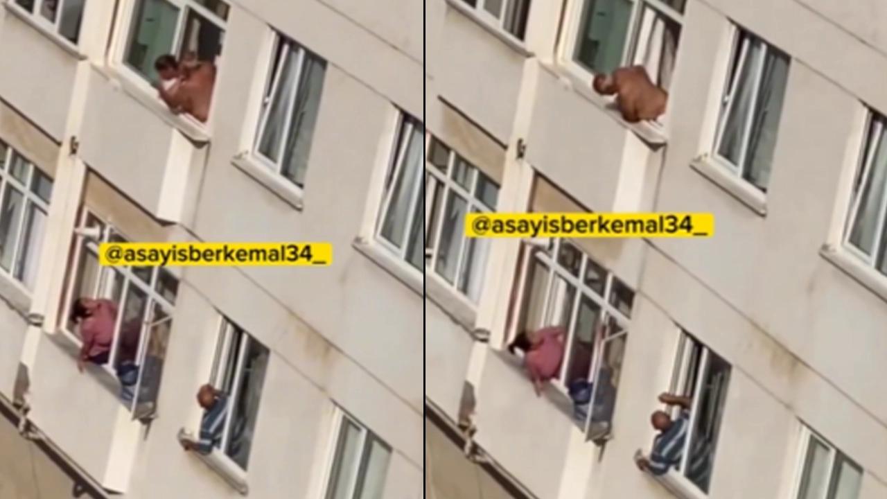 Görüntülerde üst katta oturan kişilerin alt kattaki kişilerle bağrıştığı görüldü. Öte yandan adamın pencerede olduğu görülürken karısının cama çıkmak istediği esnada fiziksel saldırıda bulunduğu da görüldü.