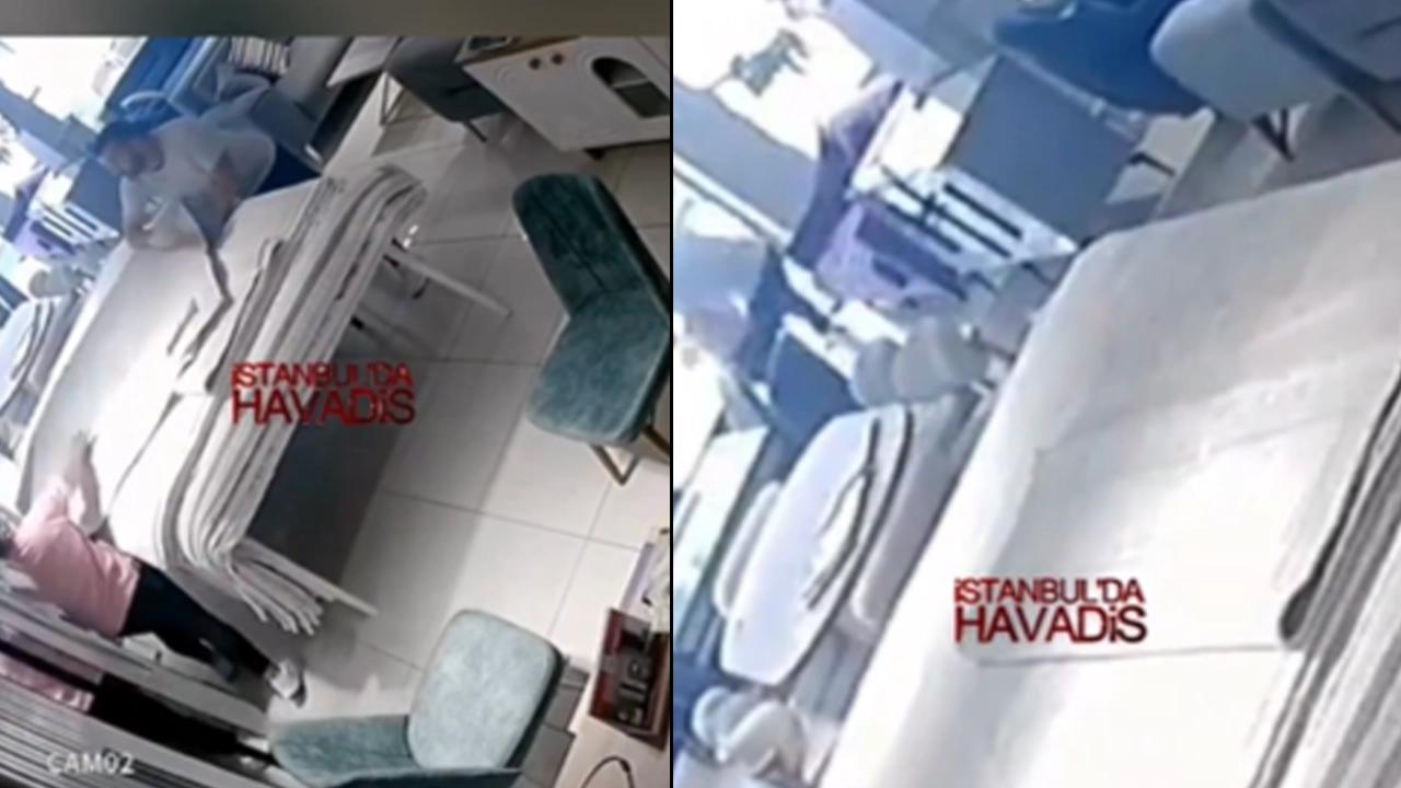 Dehşet dolu anlar iş yerine ait güvenlik kamerasına yansırken eşine saldıran adama çevrede bulunan bir vatandaşın müdahale ettiği görüldü.