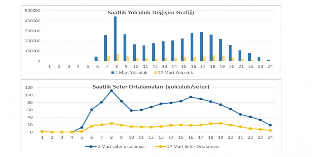 Otobüs ve metrobüslerde yolculuk değişimi ve sefer başı yolculuk ortalamaları incelendiğinde, sefer başı ortalama yolculuk sayısının 25 i geçmediği görülüyor.