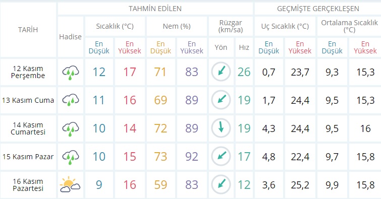 Hava bugün İstanbul'da en düşük 12, en yüksek 17 derece olacak. Yarından itibaren düşmeye başlayacak. Cuma günü 11 ila 16 derece arasında değişmesi beklenen sıcaklık cumartesi yine düşüş yaşayacak. 10 ila 14 derecenin görülebileceği cumartesiden sonra pazar da yağışlı geçecek. En düşük 10, en yüksek 15 derece bekleniyor. Pazartesi ise parçalı bulutlu bir hava İstanbulluları bekliyor. En düşük 9, en yüksek 16 derece olacak.