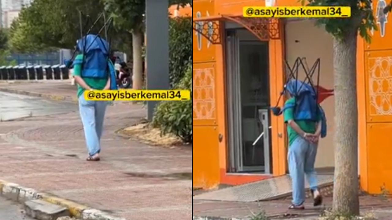 İstanbul Pendik'te bir vatandaş etkili olan sağanak yağıştan korunmak için kendince bir yol buldu.