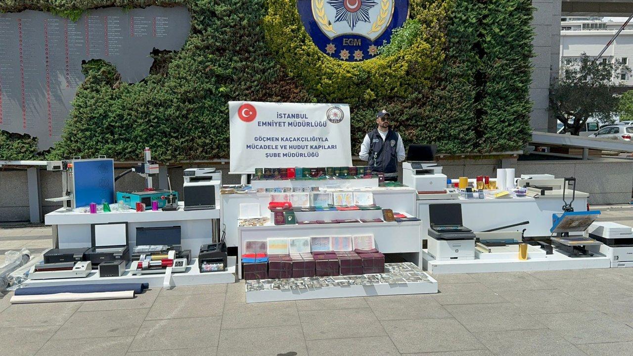 Çalışmalarını tamamlayan polis, şüphelilere operasyon düzenledi. Operasyonlarda A.A.(35), M.A.(43), A.A.A.(19) ve E.H.(30) isimli yabancı uyruklu 4 kişi yakalandı. Şüphelilere ait adreslerde yapılan aramalarda, farklı ülkelere ait 16 bin 318 sahte pasaport, sahte kimlik kartları, sahte sürücü belgeleri, hava kara hudut kapısı sahte giriş çıkış silikon mühürleri, lazer kesim cihazı, NFC cihazı, kart basım makinesi, renkli yazıcı, lazer markalama kazıyıcı makinesi, pres makinesi, 250 gram altın, 5 bin avro ve 800 dolar para ile sahte belge üretiminde kullanılan birçok materyal ele geçirildi. Operasyon çerçevesinde yakalanan şüpheliler sorgulanmak üzere emniyete götürüldü. Şebeke üyeleri hakkında başlatılan tahkikat işlemleri devam ederken, ele geçirilen sahte pasaport ve çeşitli belgeler İstanbul Emniyet Müdürlüğü'nün avlusunda sergilendi.