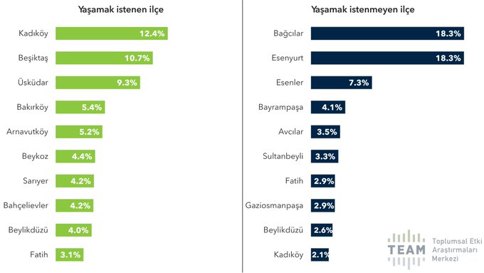 İstanbulluların gözde ilçeleri Kadıköy, Beşiktaş ve Üsküdar. Bağcılar, Esenyurt ve Esenler ise en fazla yaşanmak istenmeyen ilçeler arasında.