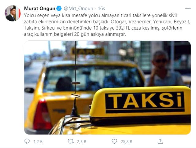 Bu kapsamda İstanbul Büyükşehir Belediye sivil zabıta ekipleri tarafından taksicilere denetim yapıldı.Konuyla ilgili olarak sosyal medya hesabından açıklamada bulunan İBB Sözcüsü konuyla ilgili olarak yaptığı açıklamada denetimlerin; Otogar, Vezneciler, Yenikapı, Beyazıt, Taksim, Sirkeci ve Eminönü'nde yapıldığını bildirdi.