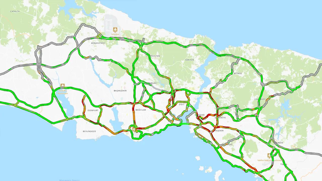 İstanbul Büyükşehir Belediyesi trafik yoğunluğu haritası verilerine göre şu anda yüzde 53'lük oran bulunuyor. Avrupa ve Anadolu yakasındaki çeşitli noktalarda kırmızı renkli yoğunluklar mevcut.