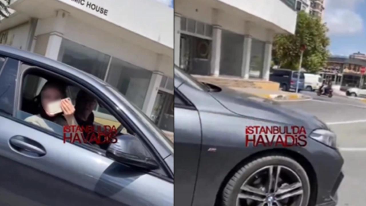 O anlar cep telefonu kamerasıyla saniye saniye görüntülendi. Görüntülerde araç sürücüyle tartışma yaşayan kadının tehdide başvurmasının ardından orta parmak gösterirken yanında bulunan adamın ise kadını sakinleştirmeye çalıştığı görüldü.