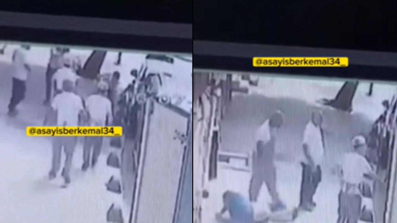 Adamın 3 kişinin acımasızca darp edildiği anlar bir iş yerine ait güvenlik kamerasına yansıdı.
