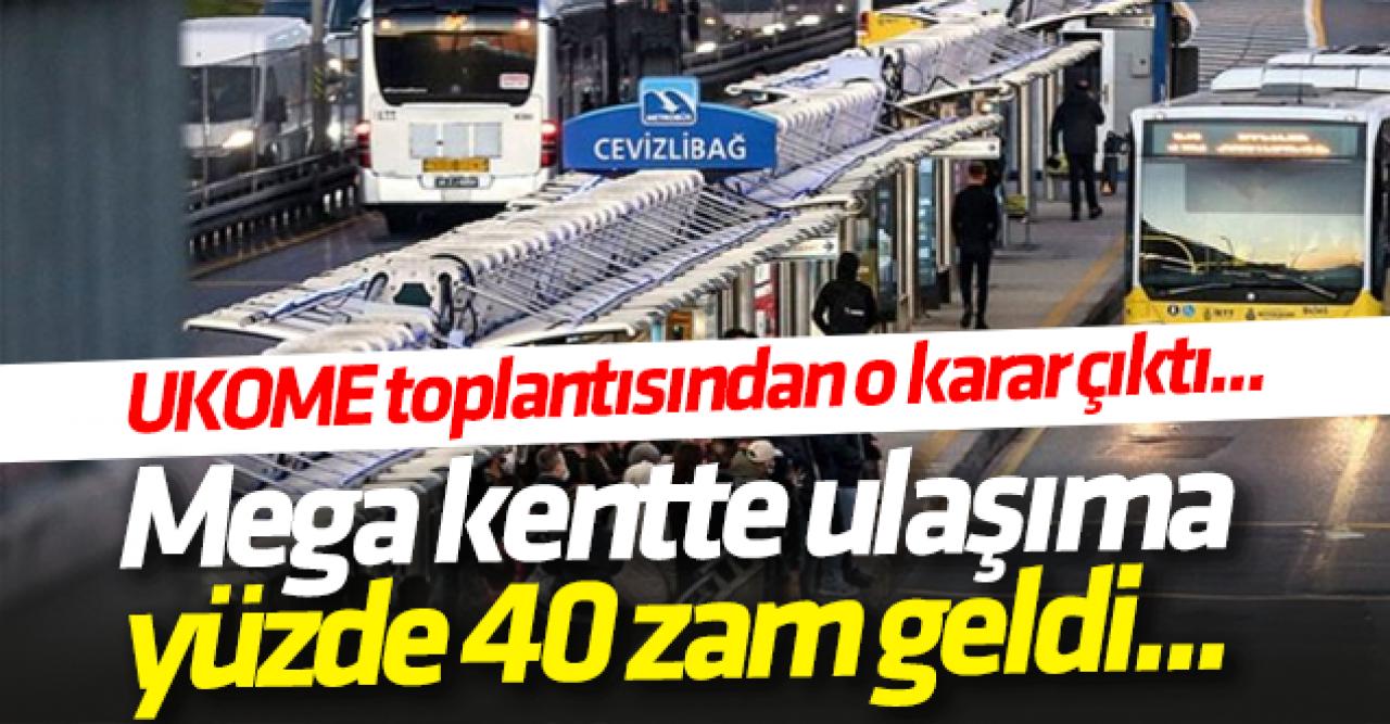 İstanbul Büyükşehir Belediyesi (İBB) Ulaşım Koordinasyon Merkezi (UKOME) bugün olağanüstü toplandı. İstanbul'da toplu ulaşıma beklenen zam geldi. Ulaşım Koordinasyon Merkezi nisan ayı toplantısında, elektronik bilet, taksi, taksi dolmuş ve minibüs ücretlerine yüzde 40’lık zam teklifi kabul edildi.