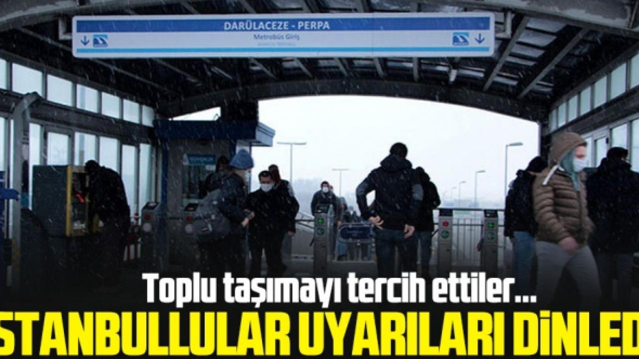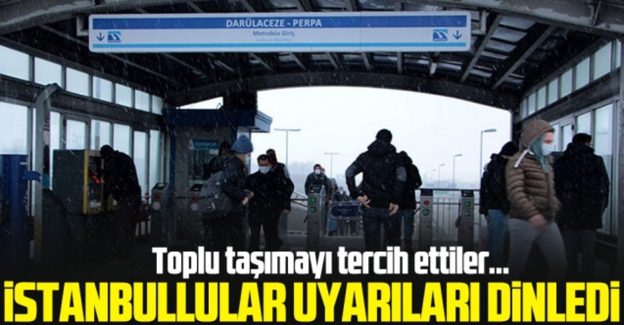 İstanbul Valiliği ve Meteoroloji genel Müdürlüğü tarafından yapılan uyarıları dikkate alan vatandaşlar, özel araçları yerine toplu taşımayı tercih etti. İstanbul Büyükşehir Belediyesi (İBB) Trafik Yoğunluğu Haritası’nda trafik saat 08.00’da yüzde 31 olarak ölçüldü. Kar yağışı pazar gününe kadar devam etmesi bekleniyor.