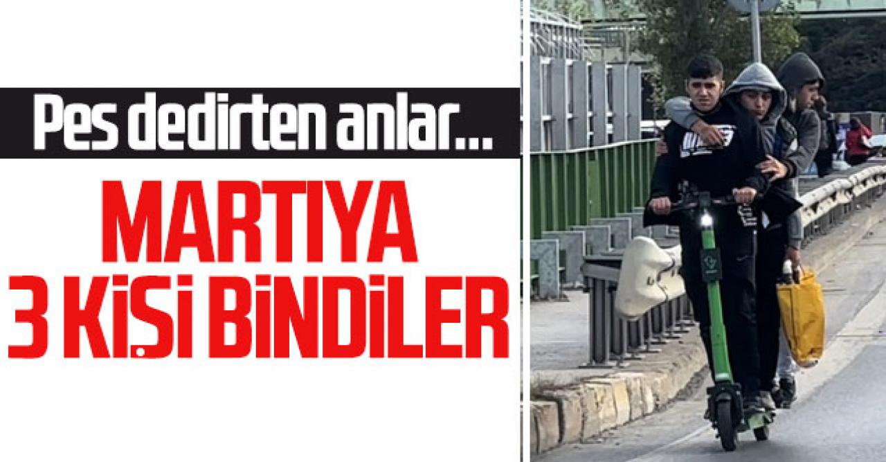 Kadıköy D-100 karayolunda elektrikli scootera aynı anda binen 3 kişinin tehlikeli yolculuğu cep telefonu kamerasına yansıdı.