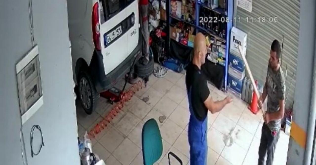 Olay, Merkez Mahallesi'nde geçen perşembe günü saat 11.00 sıralarında meydana geldi. Madde bağımlısı olduğu iddia edilen M.E., elinde kasatura ve sopayla oto tamircisine girdi. İçeride bir süre oturan M.E. ustaya hakaret edip tehditler savurdu. M.E. elindeki kasaturayı gösterdiği ustaya "Elini aç bir kere vuracağım yoksa aileni öldürürüm" tehdidinde bulundu. Ardından tamircinin açtığı eline ve bacaklarına sopayla defalarca vurup dışarı çıktı. Aynı gün tamirciye gelen M.E. bu sefer dükkanın önündeki otomobil aküsünü alarak çek çek arabasıyla götürdü. Olaya şahit olan dükkan çalışanları durdurmaya çalışsa da M.E.'nin aküyü götürmesine engel olamadı. M.E.'nin aynı caddedeki restoranın camına da sandalye attığını gören çevredekiler polise haber verdi. Yaşananlar güvenlik kamerasına yansıdı. Polisin yaptığı çalışmalar sonucu yakalanan M.E. polis merkezindeki işlemlerin ardından sevk edildiği adliyede tutuklanarak cezaevine gönderildi.
