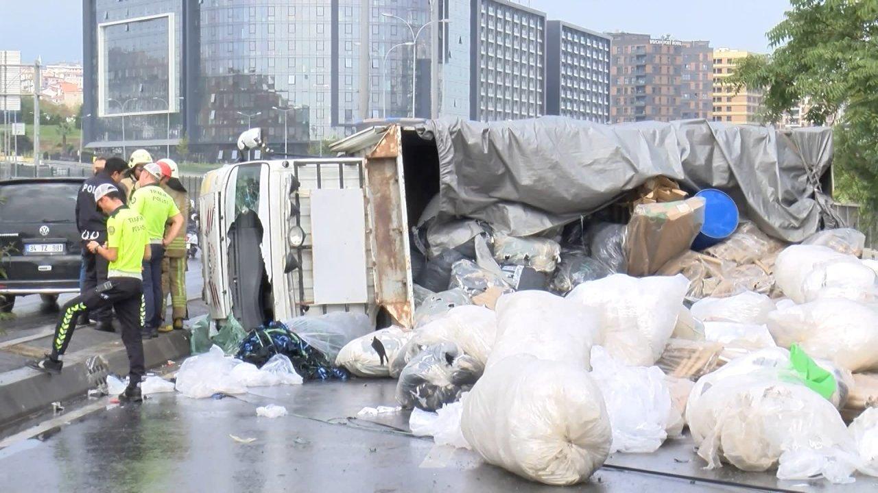 Küçükçekmece D-100 Karayolu Yanyol'da kumaş ve atık tekstil ürünleri yüklü kamyonet demir bariyerlere çarparak devrildi. Kazada sürücü ve yanında bulunan bir kişi yaralandı.