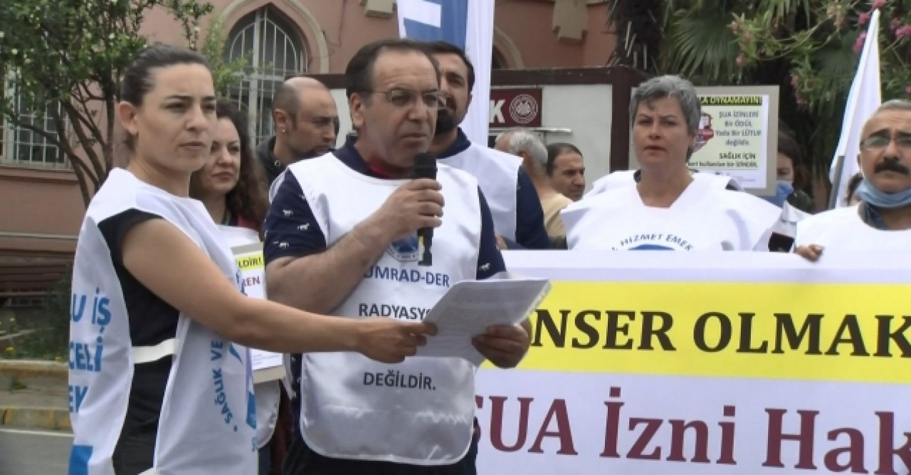 ŞUA izinlerine dönük düzenlemeye itirazı dile getirmek ve radyoloji çalışanlarının yaşadığı sorunları paylaşmak için toplanan çalışanlar basın açıklaması okudu. Tüm Radyoloji Teknisyenleri Derneği Başkanı Heybet Aslanoğlu, çalışanların kanser riskinin arttığına dikkat çekerek basın açıklaması yaptı. Tüm Radyoloji Teknisyenleri Derneği Başkanı Heybet Aslanoğlu, "ŞUA izinlerinin kaldırılması veya kullandırılmaması bizlerin daha uzun süre radyasyonla çalışması demek. Bizlerin kanser olması demek. Bizler kanser olmak istemiyoruz. Bizler görevimizi yaparken şiddete maruz kalmak istemiyoruz. Pandemi gibi önlenebilir hastalıklardan ölmek istemiyoruz. Radyasyondan dolayı kanser de olmak istemiyoruz. Sağlık emekçilerine ve temsilcilerine kulak verilmelidir. Ekonomik ve özlük hakları iyileştirilmeli talepleri karşılanmalıdır. Şiddetten arınmış güvenli ve sağlıklı bir çalışma ortamı istiyoruz” dedi.