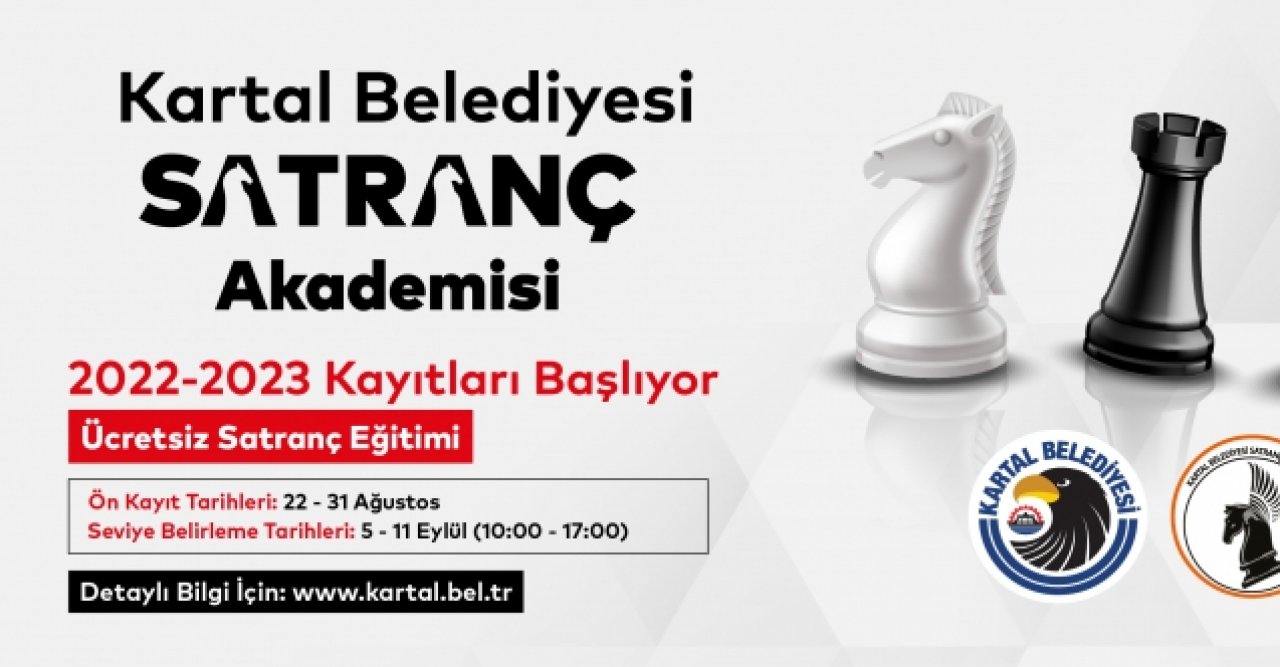 Kartal Belediyesi Gençlik ve Spor Hizmetleri Müdürlüğü’ne bağlı olarak hizmet veren Satranç Akademisi’nde 2022-2023 eğitim dönemine katılmak isteyen çocuklar ve gençler, 22-31 Ağustos 2022 tarihleri arasında ön kayıtlarını yaptırabilecek. 6-18 yaş arası çocukların ve gençlerin başvuru yapabileceği Satranç Akademisi’nin kayıtları, Kartal Belediyesi’nin internet sitesi üzerinden yapılabilecek.