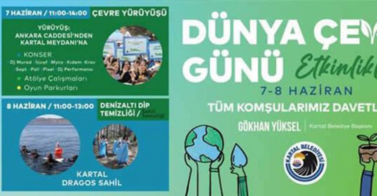 Kartal Belediyesi Çevre Koruma ve Kontrol Müdürlüğü tarafından düzenlenecek etkinlikler 7 Haziran Salı günü Ankara Caddesi’nden Kartal Meydanı’na çevre yürüyüşü ile başlayacak. Saat 11.00’de başlayacak yürüyüşün ardından Kartal Meydanı’nda rap şarkıcıları İtiraf, Myco, Kıdem, Krav, Sept, Poli ve Pixel bir konser verecek. DJ performansının da yer aldığı etkinliklerde atölye çalışmaları, şişme oyun parkurları da yer alacak. Geri dönüşümün önemine dikkat çekmek amacıyla Atıklardan Hayal Dünyası Yarışma Sergisi ve ödül töreni de gerçekleştirilecek. Dünya Çevre Günü etkinlikleri kapsamında 8 Haziran Çarşamba günü de toplumsal duyarlılık oluşturmak amacıyla etkinlikler devam edecek. Saat 11.00’de başlayacak etkinliklerde dalgıçlar eşliğinde denizaltı dip temizliği yapılacak. Denizi kirleterek ekosisteme zarar veren atıklar çıkarılarak sergilenecek. Ayrıca sahil temizliği de yapılarak çevrenin önemine bir kez daha dikkat çekilecek.