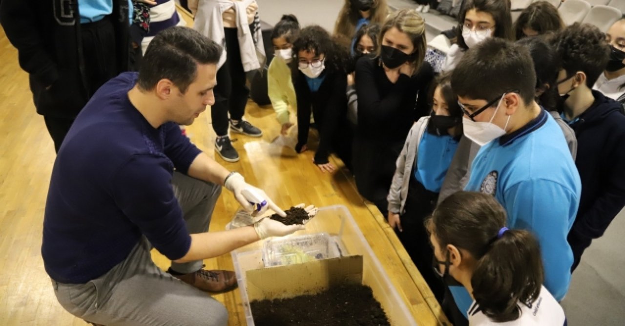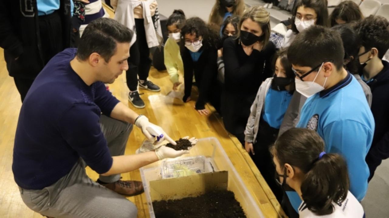 Etkinlik solucan gübresi sunumu ile devam etti. Kartal Belediyesi Çevre Koruma ve Kontrol Müdürlüğü tarafından yapılan sunumda öğrencilere ‘Kırmızı California Solucanı’ ve gübresi tanıtıldı. Solucan gübresinin nasıl elde edileceği ve kullanım alanları anlatılarak, sunumda kullanılan solucanlar okula hediye edildi.