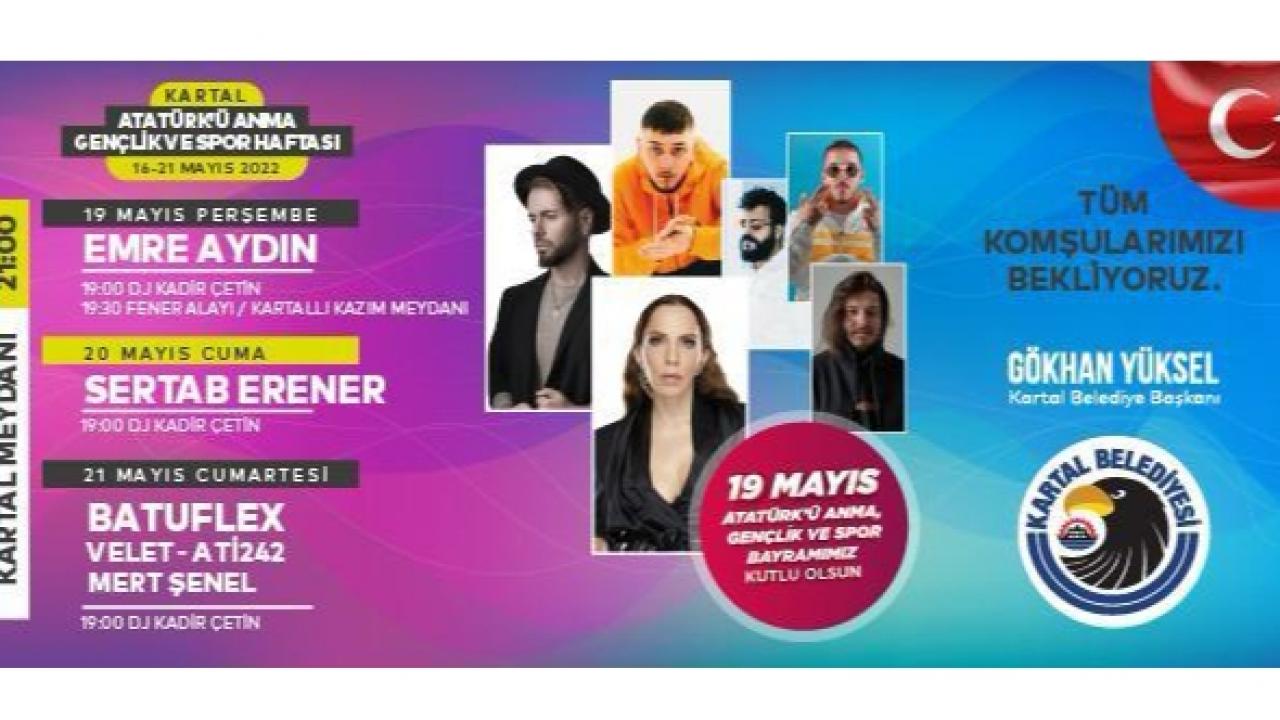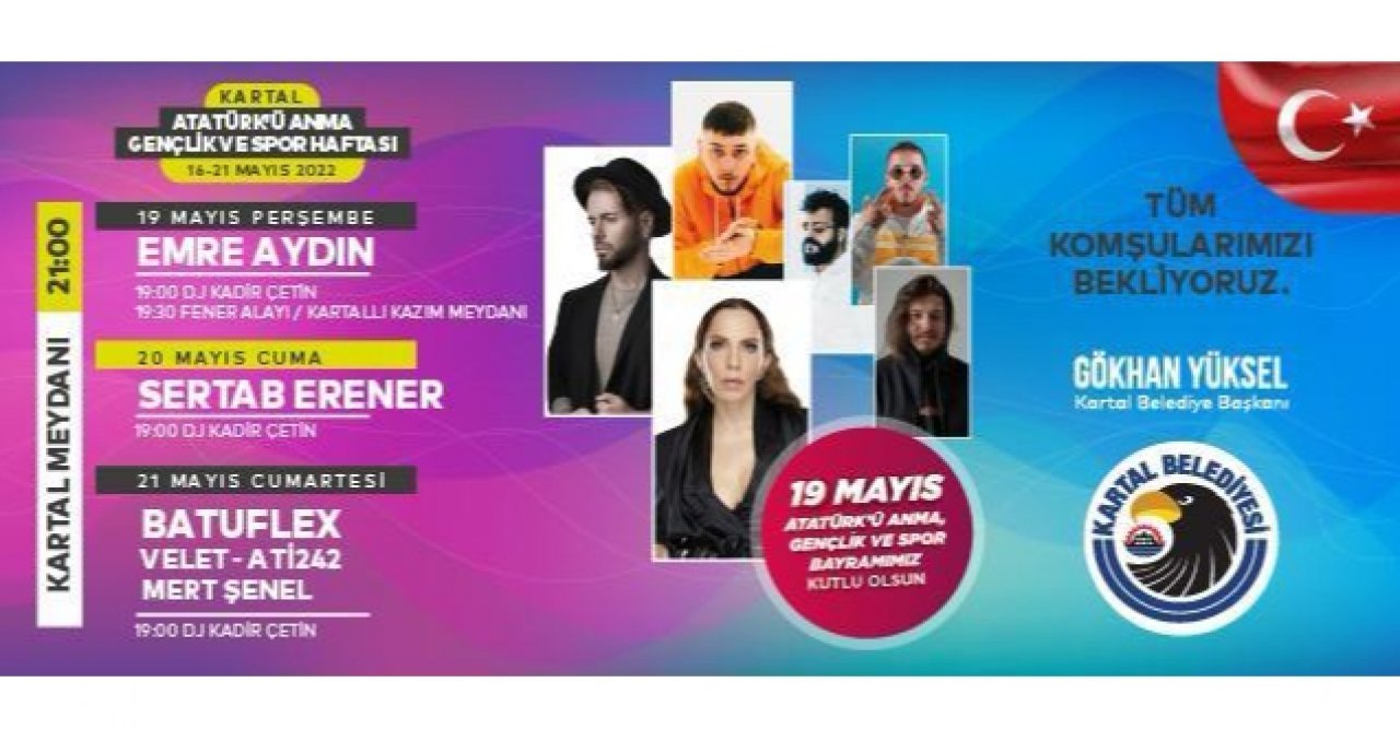 Kartal Belediyesi’nin düzenlediği kutlamalar kapsamında Emre Aydın, Sertab Erener ile rap dünyasının sevilen isimleri Batuflex, Velet, Ati242 ve Mert Şenel şarkılarıyla Kartal Meydanı’nda bir dizi konsere imza atacak. Dj Kadir Çetin’in sahne performanslarının da yer alacağı kutlamalar kapsamında Kartallılar 19 Mayıs heyecanını üç gün üç gece yaşayacak.