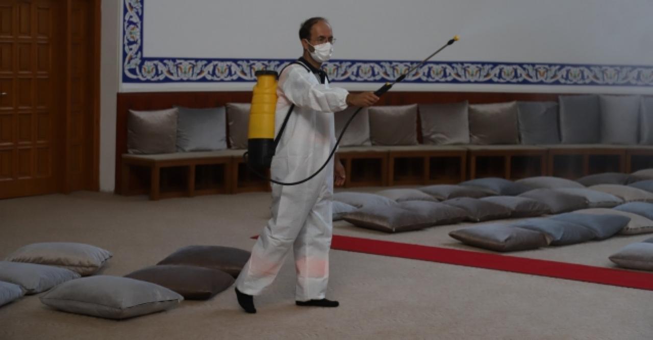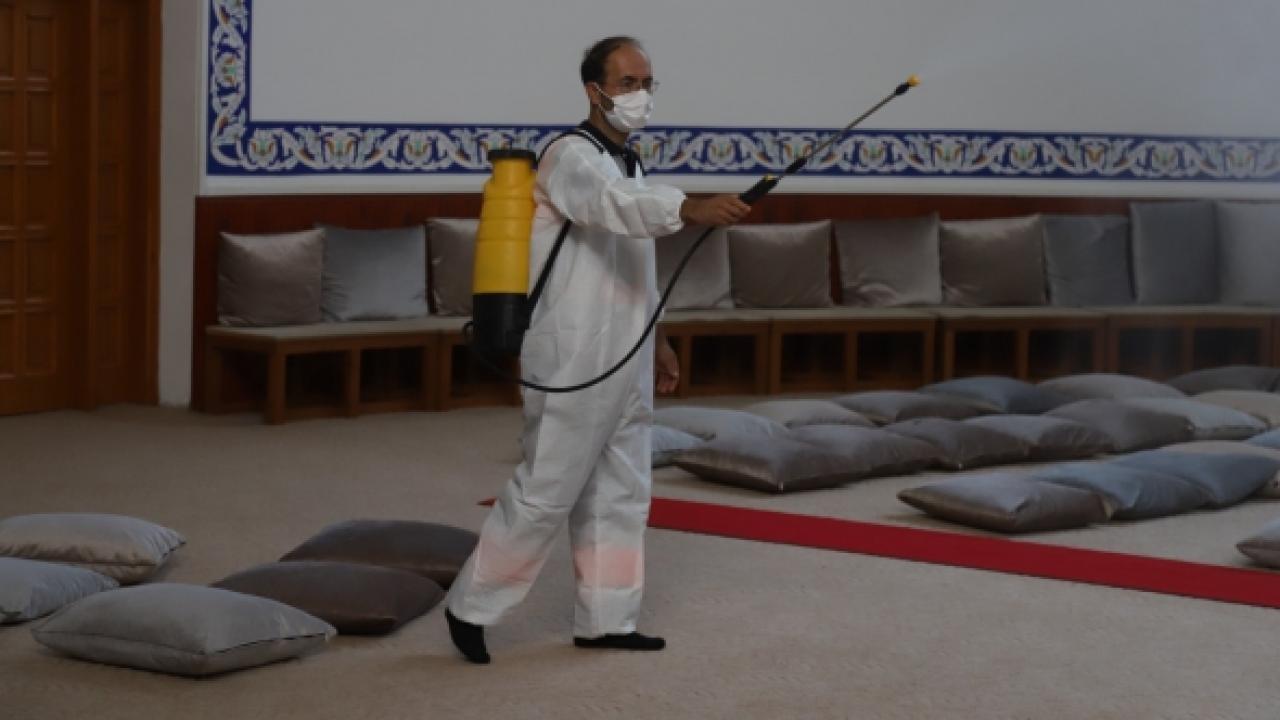 İbadethanelere gelen vatandaşların dokunabileceği duvarlar, merdivenler, korkuluklar, ayakkabılıklar, kapılar, tırabzanlar ve dezenfektan üniteleri de ekiplerin dezenfekte işleminden payını aldı.