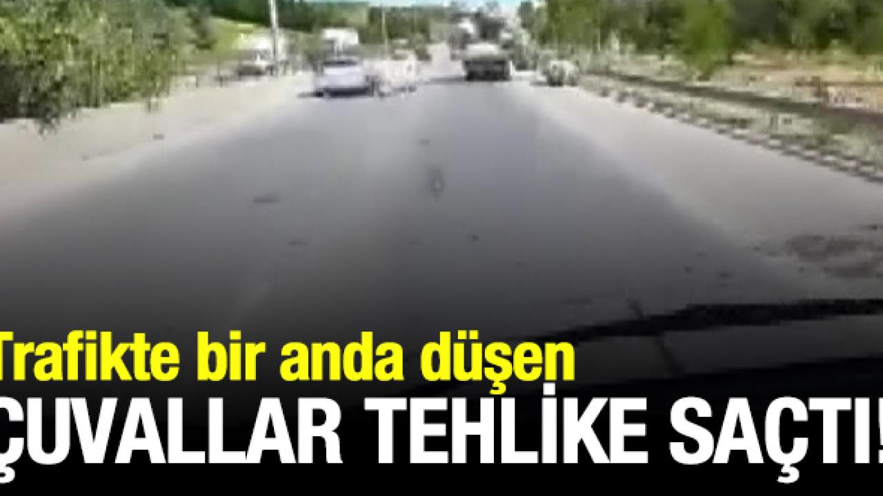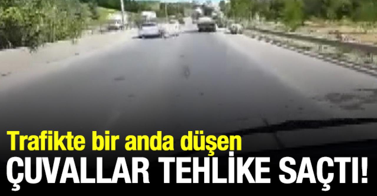 Kartal'da aşırı yüklü kamyonetten yola düşen çuvallar sürücülere zor anlar yaşattı. Kazaya davetiye çıkaran o anlar başka bir sürücünün cep telefonu kamerası ile görüntülendi.