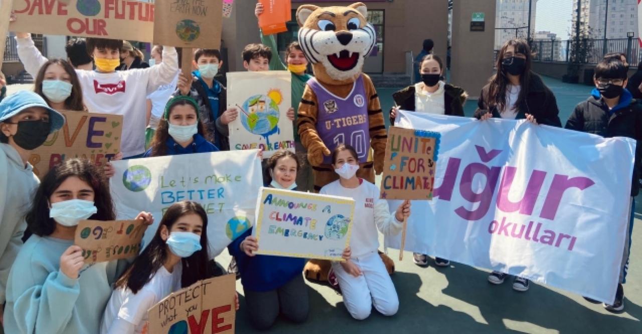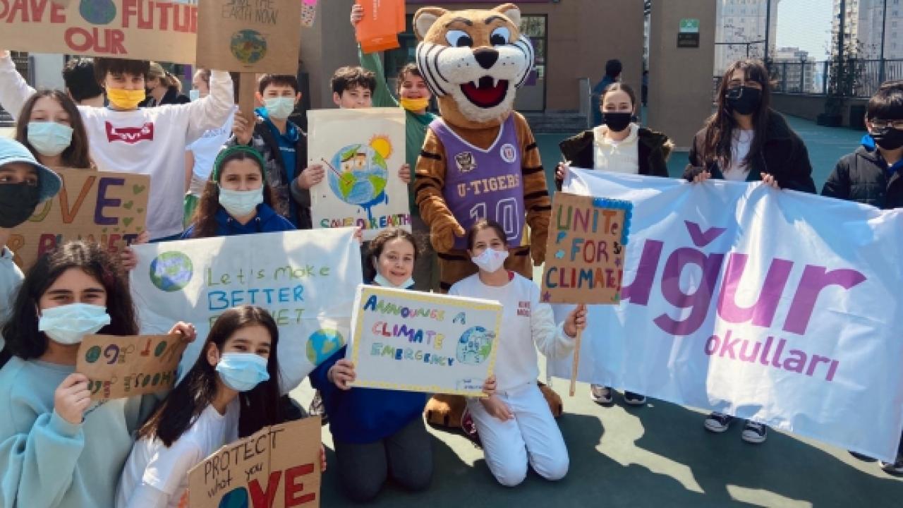 Dünyada her yıl 25 Mart tarihinde eş zamanlı olarak düzenlenen Küresel İklim Grevine, Uğur Okulları Türkiye’nin 52 ilinde 112 okulunda öğrenim gören öğrencileriyle katıldı. “Bir Dünya Daha Yok” sloganıyla küresel iklim krizine karşı sorumlu atmayı amaçlayan öğrenciler, bu özel gün kapsamında geri dönüşüm malzemelerini kullanarak hazırladıkları afişlerle daha iyi ve yaşanabilir bir dünya için harekete geçilmesi çağrısında bulundu. Her kampüsten seçilen Sürdürülebilirlik Elçileri veya İklim Sözcüleri günün önemini anlatan bildiriler sundu.