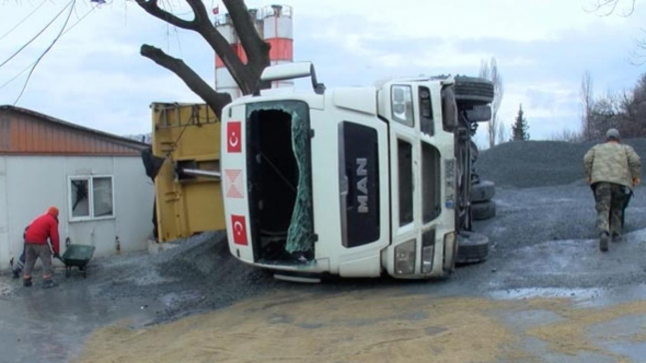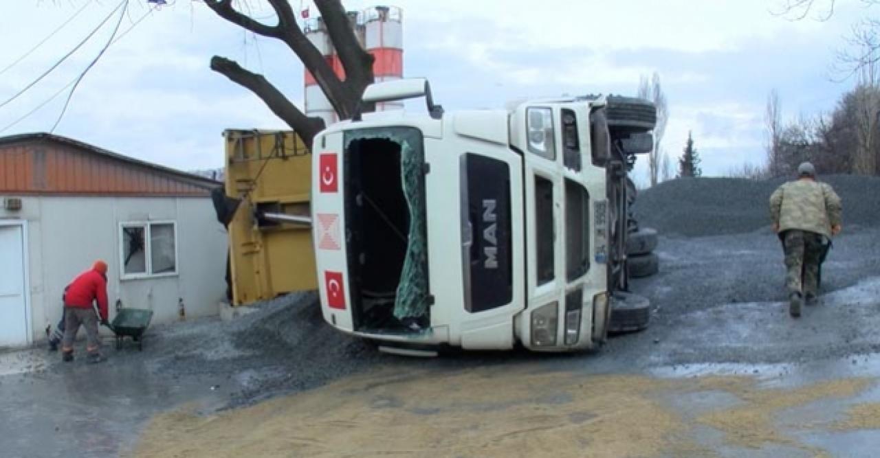 Küçükçekmece'de hazır beton şantiyesine çakıl taşı boşaltan kamyon devrildi. Araç içinde sıkışan sürücü itfaiye ekipleri tarafından çıkarıldı.