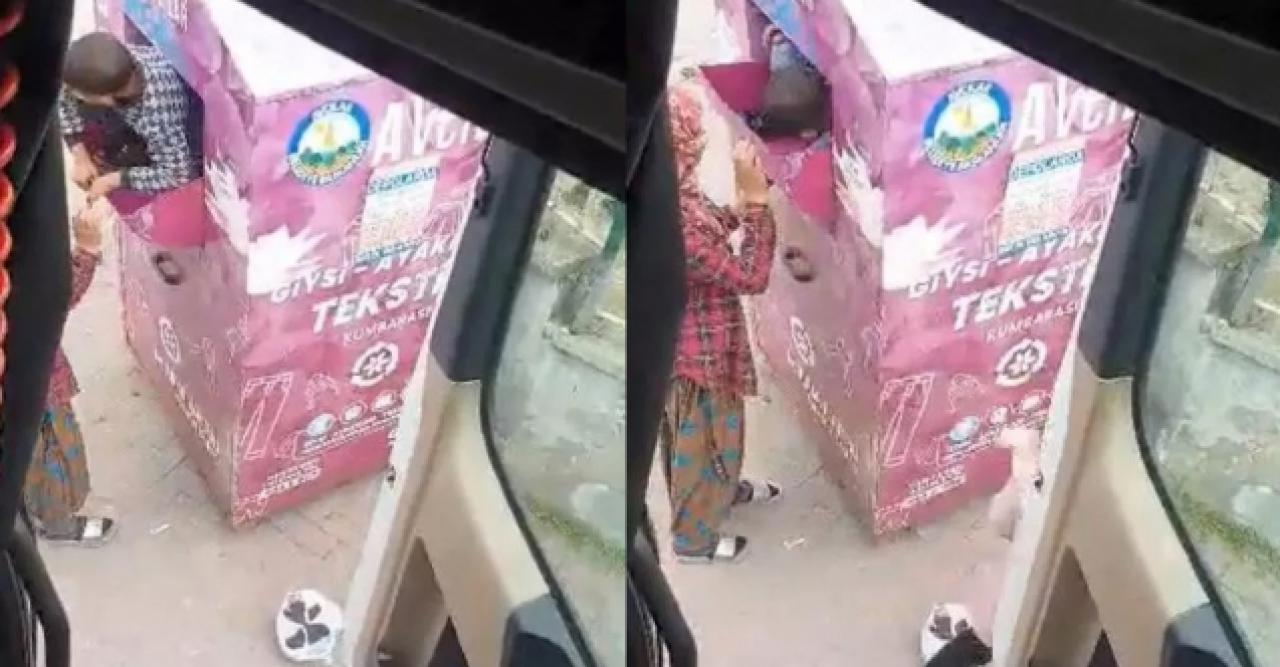 Mustafa Kemal Paşa Mahallesi'ndeki merkezi noktaya yerleştirilen kullanılmış kıyafet, ayakkabı ve teksil ürünlerinin bulunduğu geri dönüşüm kumbarasının yanına gelen bir kadın kapağı açarak 4-5 yaşlarındaki oğlunu içine soktu. Çocuk kumbaranın içerisindeki kıyafet ve dolu poşetleri tek tek kumbaranın haznesine bırakırken annesi de bunları alarak yere bıraktı. Bir araçta bulunanlar tarafından cep telefonu ile görüntülenen hırsızlıkta kadın her defasında çevreyi kontrol ederek poşetleri kumbaradan alırken yanlarına gelen eşi olduğu sanılan kişi bunları topladı. Tekstil kumbarası tamamen boşaltılıncaya kadar süren hırsızlığın sonunda annesi çocuğunu çekip çıkardı. Kıyafet torbalarını bir araca yükleyen anne ve baba ile çocukları uzaklaştı.