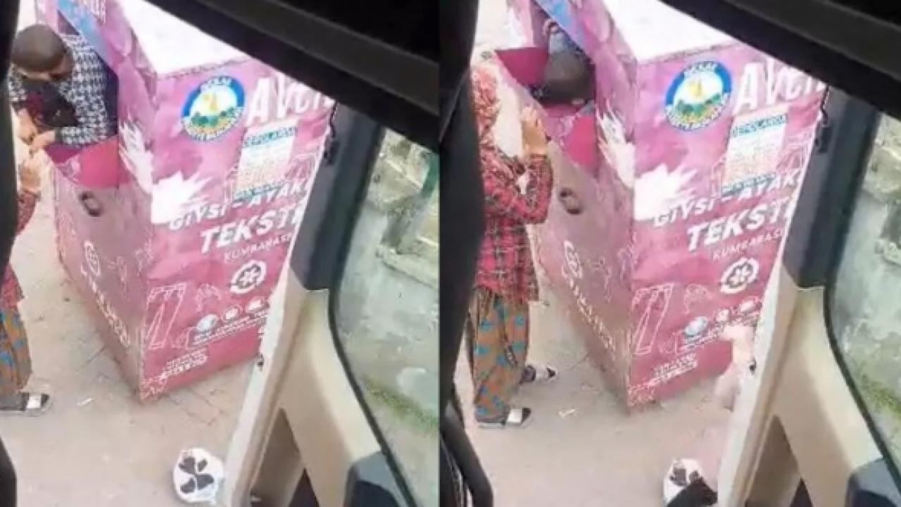Avcılar'da 10 mahalleye yerleştirilen geri dönüşüm kumbaralarından birine oğlunu sokarak içindeki tüm kıyafetleri dışarı çıkartan çift cep telefonu ile görüntülendi.