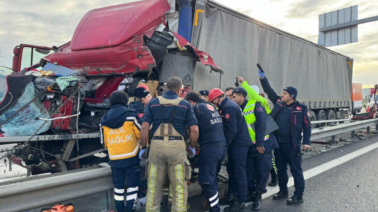 TEM Büyükçekmece'de lastiği patlayan TIR bariyere çarparak kaza yaptı. Araç içinde sıkışan şoför Umut Sünger, itfaiye ekipleri tarafından kurtarıldı.