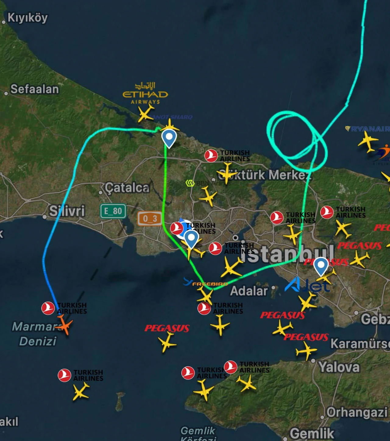 Şiddetli rüzgar ve yoğun yağış nedeniyle inişe geçmek isteyen uçaklar havada tur atmak zorunda kaldı. Bu süreçte yakıt kritiğine giren bazı uçaklar, güvenlik nedeniyle İzmir Adnan Menderes Havalimanı gibi alternatif noktalara yönlendirildi.