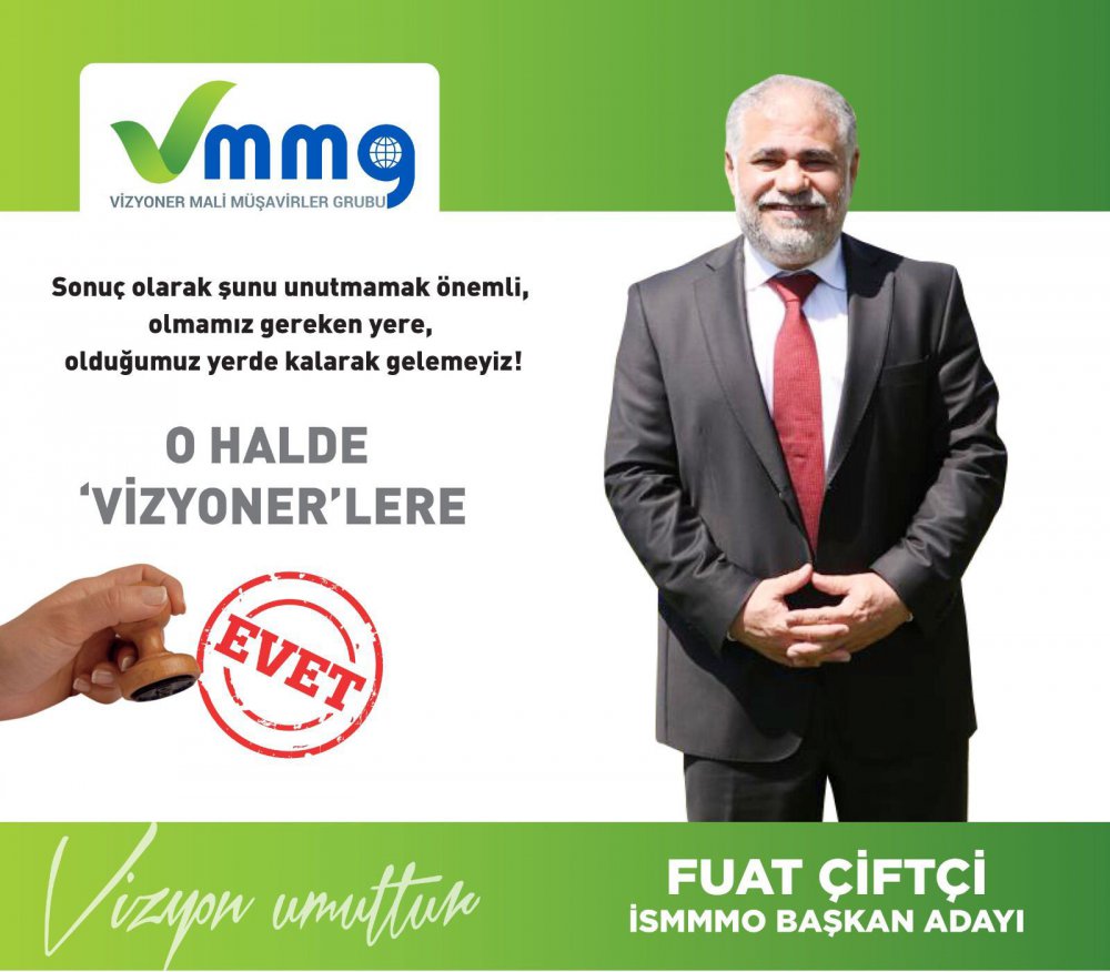 Vizyoner Mali Müşavirler Grubu'nun son zamanlarda yaptığı çalışmalar son derece takdir edilirken bu enerji ile girdikleri oda seçimlerinden zaferle ayrılacakları tahmin ediliyor. Fuat Çiftçi başkanlığındaki Vizyoner Mali Müşavirler Grubu'nun seçim öncesi yaptığı aday tanıtım programı meslek mensupları tarafından yoğun ilgi gördü. Her gün güçlenerek büyüdüklerini söyleyen Çiftçi “Kimseyi ötekileştirmeden meslek ve meslektaş üzerindeki vesayeti red ettiklerini belirtip, bu konuyla ilgili düşüncesi projesi olan olan ve ötekileştiren bütün meslektaşarı Vizyoner çatısı altına devet ediyorum” diyerek sözlerini tamamladı.