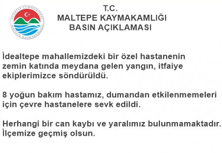 "İdealtepe mahallemizdeki bir özel hastanenin zemin katında meydana gelen yangın, itfaiye ekiplerimizce söndürüldü