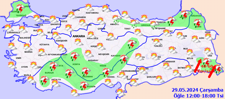 MGM uyarısının devamında; Trakya Kesimi, Batı Akdeniz'in iç kesimleri ile Toroslar Mevkii, İç Anadolu (Eskişehir dışında), Orta Karadeniz, Kastamonu, Artvin, Ardahan, Kars ve Hakkari çevreleri ile Rize ve Trabzon'un iç kesimlerinin yerel sağanak ve gök gürültülü sağanak yağışlı geçeceği tahmin ediliyor.