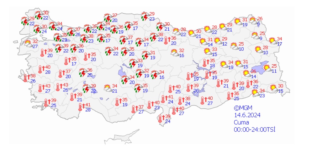 Türkiye genelinde 14 Haziran 2024 Cuma günü hava yurt genelinde 30 derecenin üzerinde seyredecek. Marmara Bölgesi'nde gök gürültülü kuvvetli sağanak yağışlar etkili olurken, Ege ve Akdeniz Bölgelerinde sıcaklık 40 dereceyi bulacak. Ayrıca kuvvetli rüzgar nedeniyle fırtına bekleniyor.