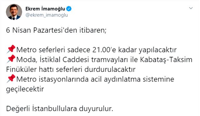 6 Nisan Pazartesi'den itibaren; metro seferleri sadece 21.00'e kadar yapılacaktır. Moda, İstiklal Caddesi tramvayları ile Kabataş- Taksim Finüküler hattı seferleri durdurulacaktır. Metro istasyonlarında acil aydınlatma sistemine geçilecektir. Değerli İstanbullulara duyurulur.