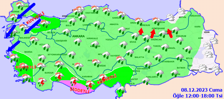 MGM'deki uyarıya göre; Ülkemiz genelinin parçalı ve çok bulutlu, ülke geneli (Doğu Anadolu'nun doğusu, Rize çevreleri ve Artvin kıyıları dışında) yağmur ve sağanak yağışlı, Akdeniz kıyıları gök gürültülü sağanak yağışlı geçeceği tahmin ediliyor. Yağışların; Marmara'nın doğusu, Ege , Akdeniz, Doğu Anadolu'nun güneybatısı ile Çanakkale'nin doğusu, Diyarbakır ve Adıyaman çevrelerinde kuvvetli, Antalya'nın merkez ve batısı, Mersin çevreleri ve Adana'nın güney kesimlerinde yer yer çok kuvvetli, Antalya’nın doğusunda çok kuvvetli ve yer yer şiddetli olması bekleniyor.
