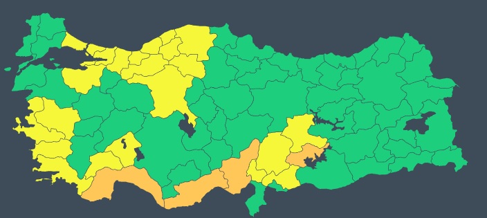 Sarı kod alan iller; İstanbul, Bursa, Yalova, Kocaeli, Sakarya, Düzce, Bolu, Ankara, Aydın, Burdur, Çankırı, Isparta, Kastamonu, Malatya, Kahramanmaraş, Bartın, Karabük, Gaziantep, İzmir, Manisa, Muğla, Zonguldak illeri geneline yağmur ve gök gürültülü sağanak yağış uyarısı