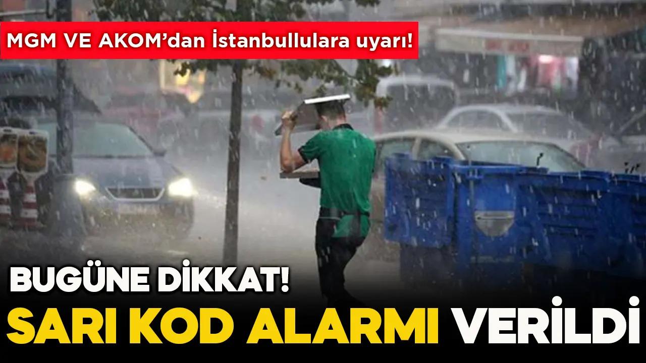 Meteoroloji Genel Müdürlüğü (MGM) dün İstanbul'da yerel olarak etkili olan ani ve kuvvetli sağanak yağışın ardından bugün yeniden uyarıda bulundu. MGM tarafından yapılan açıklamada sarı kodlu alarm verildi.