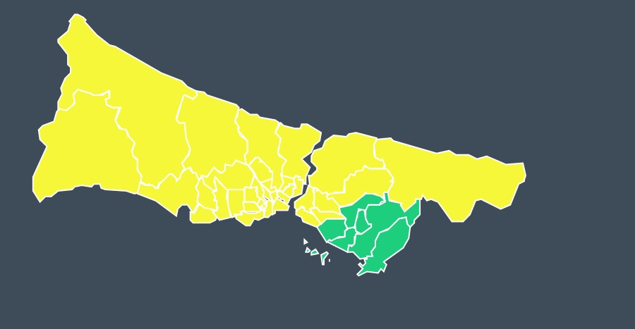 Buna göre MGM'nin verdiği sarı kod uyarısında; Bakırköy, Beşiktaş, Beykoz, Beyoğlu, Çatalca, Eyüpsultan, Fatih, Gaziosmanpaşa, Kadıköy, Sarıyer, Silivri, Şile, Şişli, Üsküdar, Zeytinburnu, Büyükçekmece, Kağıthane, Küçükçekmece, Ümraniye, Bayrampaşa, Avcılar, Bağcılar, Bahçelievler, Güngören, Esenler, Arnavutköy, Ataşehir, Başakşehir, Beylikdüzü, Çekmeköy, Esenyurt, Sultangazi ilçeleri için sarı kodlu uyarı verildi.