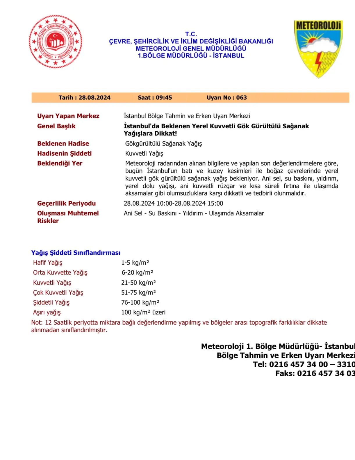 AKOM'un yaptığı uyarıda saat 10:00 ila 15:00 arasında "Ani sel ve su baskını, yıldırım, yerel dolu yağışı ve ani rüzgar nedeniyle kısa süreli fırtına, trafikte aksamaların oluşabileceği vurgusu yapıldı.