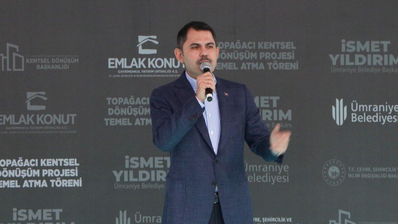 Ümraniye'nin ve Topağacı'nın geleceği adına çok önemli bir adım attıklarını söyleyerek konuşmasına başlayan Kurum, "Her gün yeni bir temel atmada, her gün yeni bir açılışta bir araya geliyoruz. Dün yine Zeytinburnu'nda 5 bin konutun Çevre Bakanlığımız öncülüğünde hem yıkımlarını hem de temel atmalarını gerçekleştirdik. Burada da bin 174 bağımsız bölümden oluşan projenin temellerini atıyoruz. Şu 2 günde yaptığımız iş koca 5 yılda İstanbul Büyükşehir Belediyesi'nin yaptıklarından daha fazla. İş bilenin kılıç kuşananın demişler." dedi.