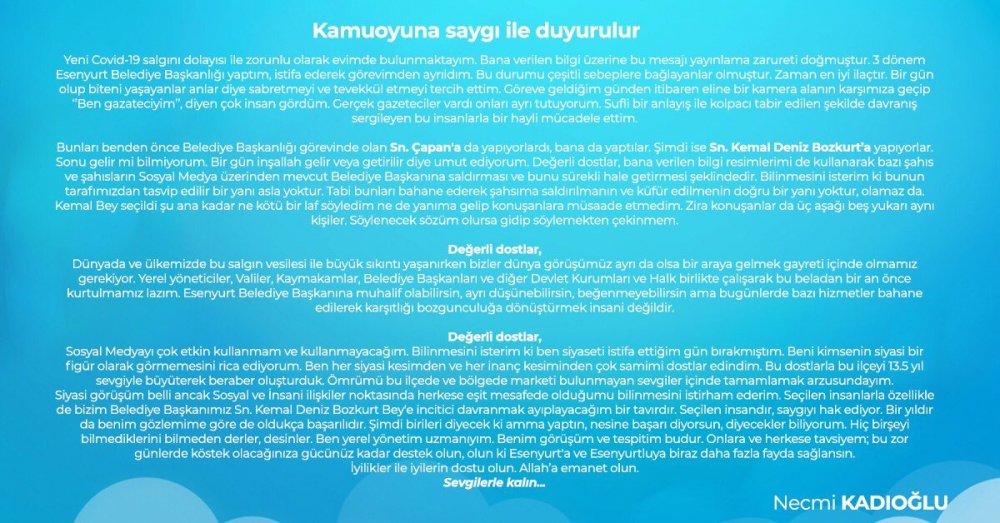 13 buçuk yıl Esenyurt Belediye Başkanlığı yapan ve son döneminde sağlık sorunlarını gerekçe göstererek istifa eden AK Partili Necmi kadıoğlu, CHP'li Başkan Kemal Deniz Bozkurt'un oldukça başarılı olduğunu söyledi. Bozkurt'un bazı gazeteciler ve sosyal medya üzerinden insafsızca eleştirildiğini belirten Kadıoğlu, "Bunları bana da, benden önce belediye başkanlığı yapan sayın Gürbüz Çapan'a da yaptılar. Bilinmesini isterim ki bunun tasvip edilir bir yanı yoktur. Kim aymazlık yapmak istiyorsa yapmasın. Şimdi birlik ve beraberlik zamanı" dedi.
