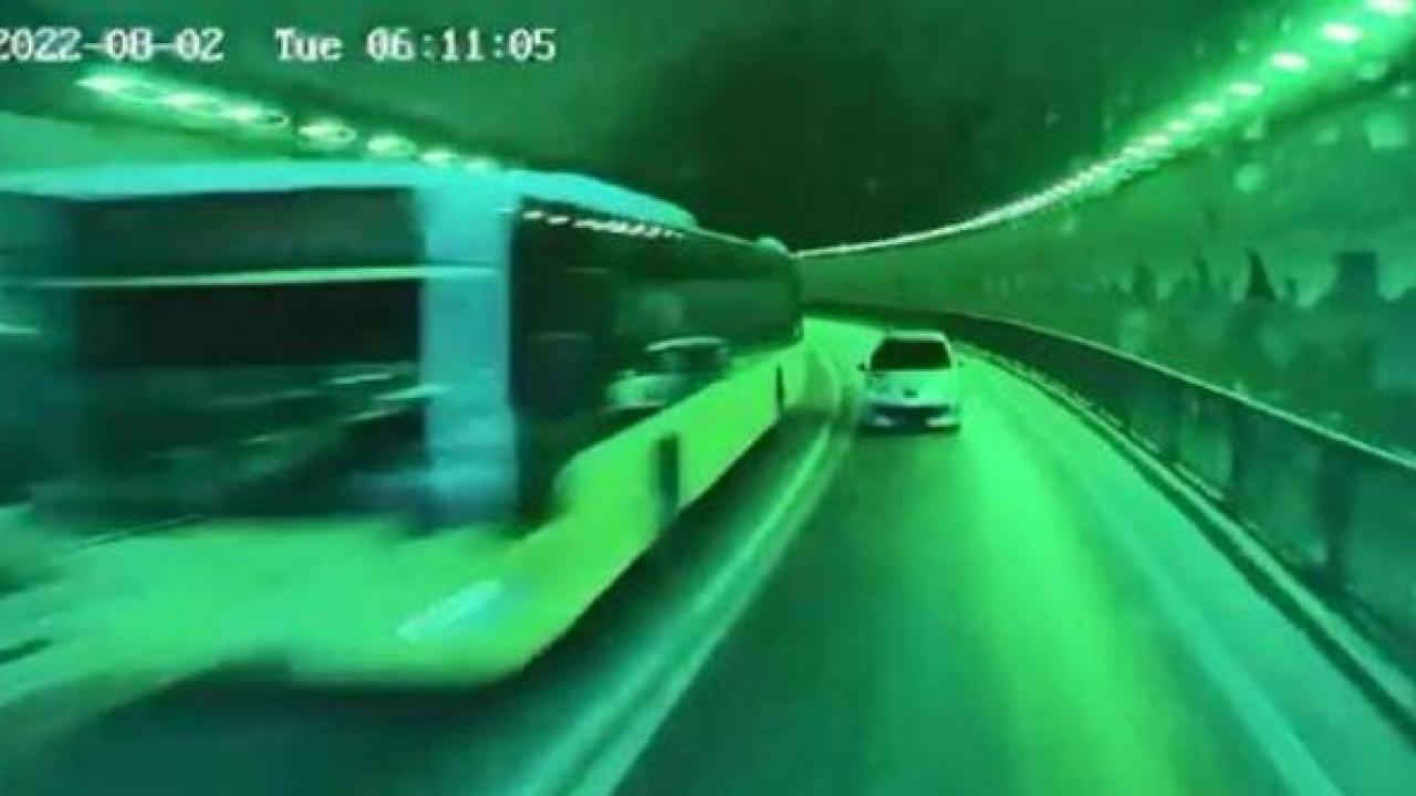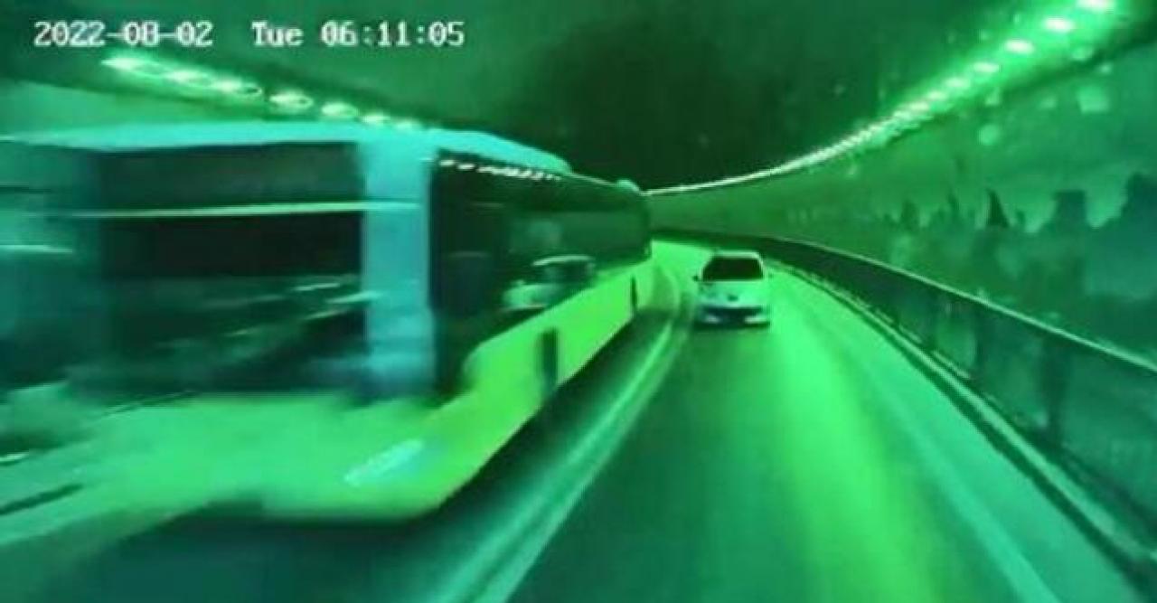 Kazanın son anda önlendiği o anlar ise otobüsün kamerası tarafından kaydedildi. Görüntülerde, tünel çıkışında hatalı sollama yapan otomobil sürücüsünü fark eden şoförün panik yapmadan son anda durduğu anlar yer alıyor. Otomobil sürücüsü ise kendi şeridine geçerek hızla olay yerinden ayrılıyor.