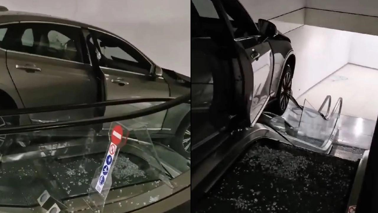 Şişli'de bir AVM'nin otoparkında sürücüsünün kontrolünü kaybettiği otomobil, camı kapıyı kırıp içeri girerek yürüyen merdivenlerde asılı kaldı. Kazada 3 kişi yaralandı.